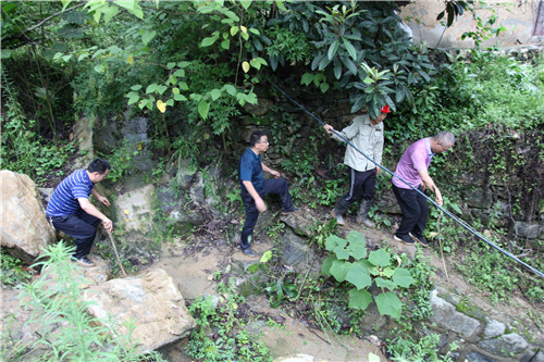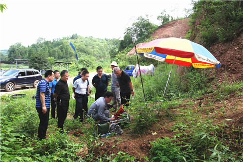 ??? 8月7日上午,鎮(zhèn)巴縣長(zhǎng)嶺鎮(zhèn)依然是空氣潮濕、天氣悶熱。檢查組前往漢中市鎮(zhèn)巴縣長(zhǎng)嶺鎮(zhèn)望月村,對(duì)地質(zhì)調(diào)查所一部承擔(dān)的《陜西省鎮(zhèn)巴縣三元-長(zhǎng)嶺地區(qū)鉀鹽預(yù)查》100km的1:2.5萬(wàn)重力剖面勘查項(xiàng)目進(jìn)行了檢查。該項(xiàng)目主要任務(wù)是:結(jié)合1:20萬(wàn)重力圈定的低重力值異常區(qū),開展重力剖面勘查,進(jìn)一步確定鉀鹽濃集中心與鹽構(gòu)造,初步判斷規(guī)模、分布特征,為優(yōu)選鉆孔提供依據(jù)。該工區(qū)山高陡峭、叢林密布,勘查工作異常艱難。