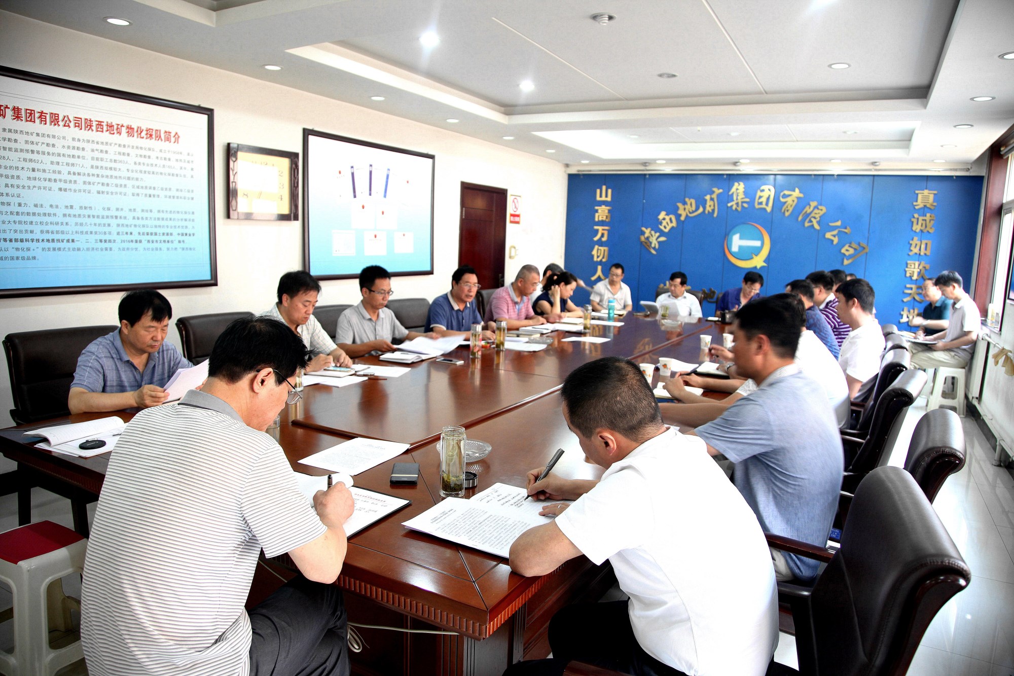 ? ??會議傳達學習了集團公司黨委書記、董事長趙廷周在集團公司半年工作會議上作的題為《緊跟新時代 聚焦新目標 奮力打造“三個地礦”》的講話;學習了集團公司黨委副書記、總經理劉建勤作的題為《提效益 防風險 促改革 抓創新 為打造“三個地礦”努力奮斗》的講話;學習了第三地質隊水工環院院長劉榮革在集團公司半年工作會議上作的《牢固樹立“三個意識” 全力以赴闖市場 增效益 謀發展》交流發言材料;各實體匯報了上半年合同簽訂情況、合同總價款、項目完成情況、收入完成情況、支出情況、任務完成情況、債權清收情況、黨風廉政建設責任制落實情況。?